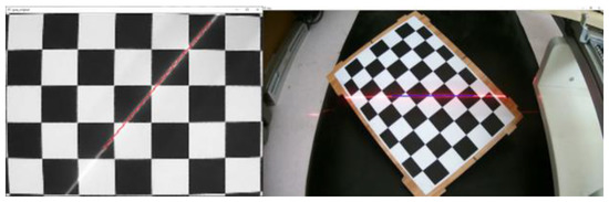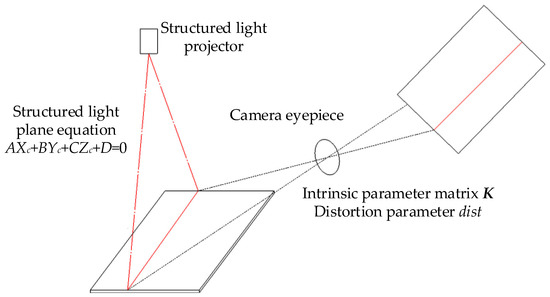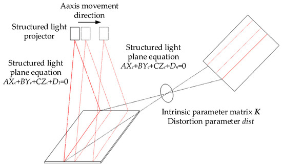 The principle of the single structured light plane calibration is shown in Figure 5, where is the intra-camera parameter matrix, is the aberration coefficient, and , , , are the structured light plane equation parameters corresponding to Equation (4).