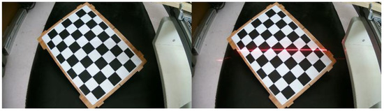 Figure 6. Image with and without structured light strip in the same position. - The rotation matrix and translation matrix for each group of images is calculated, and the homography matrix is obtained according to the correspondence between the pixel coordinates of the corner points and their world coordinates. After graying the image, the corner area is transformed to the upper left through perspective transformation. The corner ROI area of the calibration board is intercepted according to the transformed corner coordinates, as shown in Figure 7.