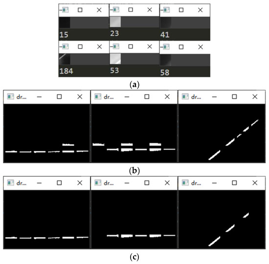 Figure 8. Structured light strip contour extraction results. (a) Pixel difference preliminary screening results; (b) Binarized image contour screening results; (c) Grids slope screening results. - Further refinement of the obtained contour is carried out, but the refinement of the contour will have the phenomenon of “warping.” So, the coordinates of the contour points are sorted and then sliced, and the head and tail points are removed and refined. The result is shown in Figure 9.