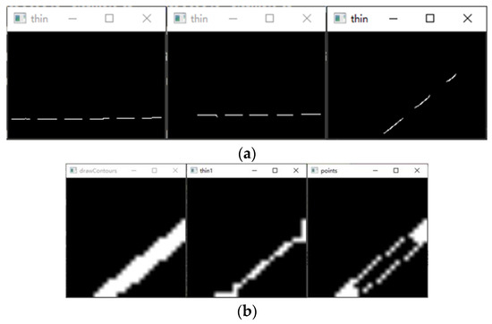 Figure 9. Structured light strip profile refinement results. (a) Preliminary refinement results; (b) Refined results after slicing. - The centerline of the structured light strip is obtained by fitting the optimized contour point coordinates. The corresponding pixel coordinates are obtained by inverse perspective transformation, as shown in Figure 10.