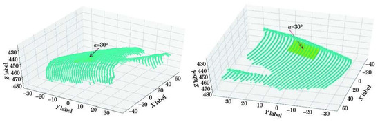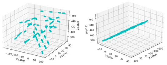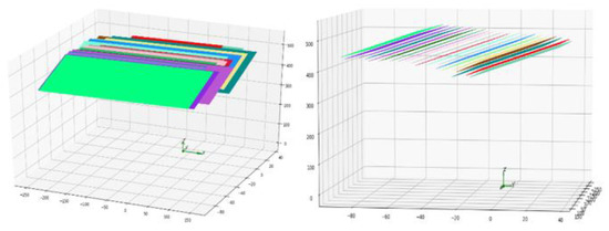 The third part (where ) is a plane constraint on the 3D spatial point coordinates. Because the same structured light projector generates all structured light strips, ideally, the collected 3D spatial points should be on the same plane. For this reason, this paper makes the distance between the spatial points and the structured light plane as small as possible, as shown in Figure 13, so that tends to 0. The purpose of introducing is to ensure that the modulus length of the plane normal vector is 1.