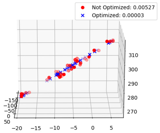 The error function consists of three parts: the first part is a reprojection constraint on the 3D spatial point coordinates so that the Euclidean distance between the original pixel coordinate point and the pixel coordinate point calculated by Equation (1) is minimized. The optimization result is shown in Table 1. “Not Optimized” is the error between the pixel coordinate points before the optimization and the initial pixel coordinate points, and “Optimized” is the error between the pixel coordinate points after the optimization and the initial pixel coordinate points.
