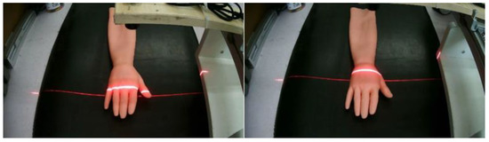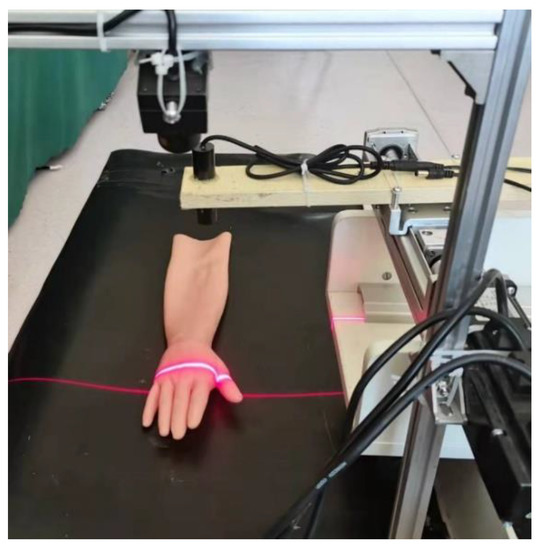 Due to a single camera’s conditions, it is impossible to recover the spatial coordinates from the pixel coordinates. To obtain the spatial coordinates of the dorsal hand into the needle region, this paper uses linear structured light to assist the measurement to obtain the depth information, as follows.
