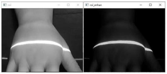 Figure 19. Grayscale image and gamma-transformed image of ROI area on the dorsal hand. - Binarization of the gamma-transformed image and closed-operation processing of the image is carried out to ensure the integrity of the structured light strips. The result is shown in Figure 20.