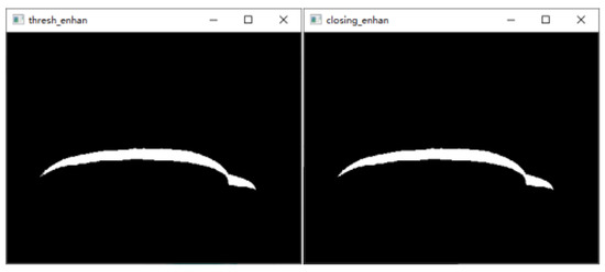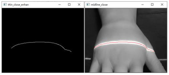 Figure 20. Binarization processing image and closed-operation processing image. - Refinement of the closed-operation processed image is carried out to extract the centerline of the structured light strip on the dorsal hand and save the point image coordinates. The results are shown in Figure 21.