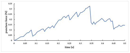 To study the influence of different needle entry angles on puncture force, in this paper, we designed puncture experiments at 30°, 45°, and 60°, and the results correspond to Figure 27a, Figure 27b, and Figure 27c, respectively. As can be seen from the figure, the smaller the angle of needle insertion, the longer the time required for the puncture process and the longer the distance of the puncture, at a constant speed. The overall trend of puncture force decreases as the angle of needle insertion increases. Therefore, it is medically recommended to use a larger entry angle to reduce the patient’s pain [39].