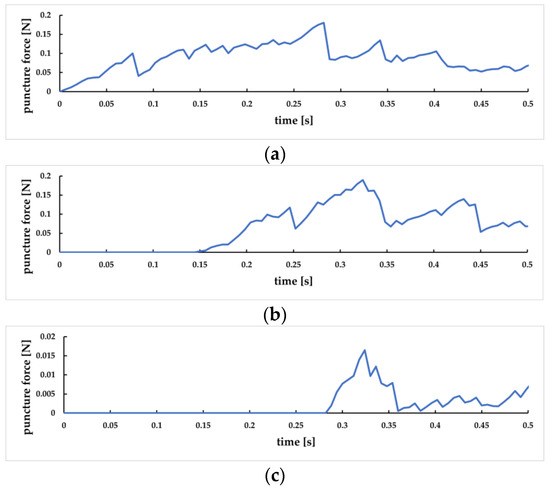 The changes in puncture force between the puncture needle and the skin layer, subcutaneous fat layer, and venous vessels are shown in Figure 26a, Figure 26b, and Figure 26c, respectively. It can be seen that at 0 s, the needle has first contact with the skin surface. At 0.07 s, the force between the needle and the skin layer decreases rapidly, indicating that it has penetrated the skin layer, corresponding to Figure 26a. At 0.14 s, the needle reached the subcutaneous fat layer. At 0.24 s, the force between the needle head and this layer decreased rapidly, indicating that it penetrated the subcutaneous fat layer, corresponding to Figure 26b. At 0.28 s, the needle has contact with the outer wall of the vein. It penetrates the blood vessel at 0.35 s, corresponding to Figure 26c. It can be observed that, in the puncture process of each tissue layer, the puncture force presents a trend of “increase decrease increase”, and when the lower epidermis is punctured, the puncture force is significantly reduced.