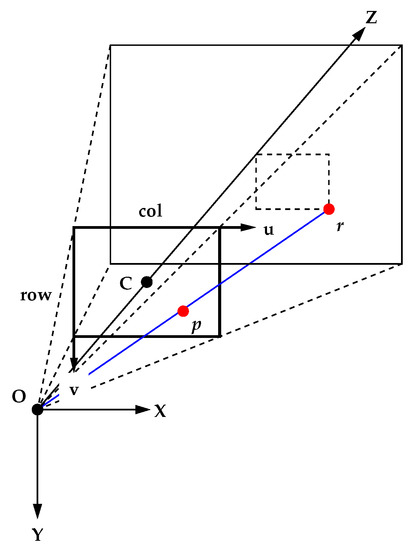 As shown in Figure 4, set up an X-Y-Z axis (world coordinate system) with the center of the camera lens as the origin O and the optical axis as the Z axis (positive in the direction of the object being imaged). The X and Y axes should coincide with the column and row directions of the camera image, respectively. Note that this coordinate system is right-handed. Denote the focal length OC of the camera as f. Let denote the position of a point on the image captured by the camera (image coordinates: unit is pixel) and denote the pixel pitch. A point at position in world coordinates is projected to position in image coordinates. In the perspective projection model, the relationship between world coordinates and image coordinates is expressed as