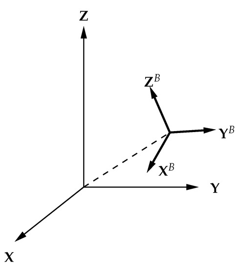 where are the world coordinates of the object system origin, representing the translation of the object system. Additionally, is a rotation matrix with , , and as column vectors, representing the rotation of the object system. This rotation matrix is obtained by using the rotation matrix of the angle around the Z axis, the rotation matrix of the angle around the Y axis, and the rotation matrix of the angle around the X axis, and can be written as (rotated in the order of Z-axis, Y-axis, and X-axis)