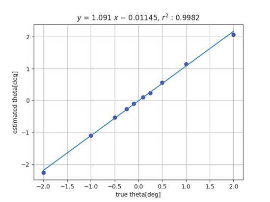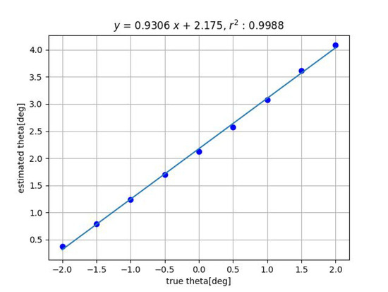 One possible cause of this is the effect of geometric distortion of the imaging system. When tilted, the grid pattern image is deformed from the orthogonal grid, and the degree of deformation represents the tilt. Therefore, the effect of image distortion is likely to appear. If image distortion is reduced by camera calibration, the slope of the fitted line will also approach 1.