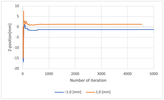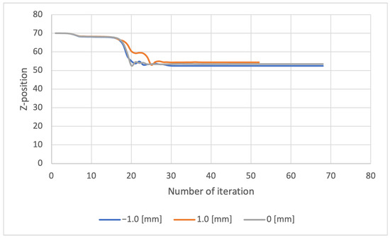 Convergence of iterative calculation of z-axis displacement in Method 2.