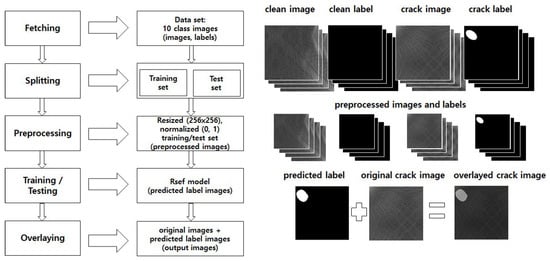 Crack detection in Rsef consists of five stages: fetching, splitting, preprocessing, training/testing, and overlaying. In the fetching stage, a dataset that consists of various texture images is stored in the storage device. We use a dataset—DAGM 2007 [31], which is a synthetic benchmark for defect detection of texture surface images and has ten classes of texture groups. The DAGM 2007 dataset is widely employed by crack detection studies and can be used for segmentation. Images in the dataset consist of two types: raw images and labels. Raw images contain diverse textures and are categorized into clean and crack images. Crack images are images with cracks or defects, and the others are clean images. Thus, the purpose of segmentation is to detect the above images correctly. Labels indicate ground truths for the segmentation; that is, clean images have a single black image and crack images have white regions per image. We consider that a white region should cover the crack in the right place if there is a crack in the image; thus, it is a segmentation issue (where is the crack region if it exists?). Next, in the splitting stage, we split the images in the dataset into two subsets: training and test set. Each subset goes through the preprocessing stage, where the images are adjusted to an easy-to-handle and efficient form for the neural network. Specifically, all images are resized to 256 × 256 pixel-sized images, and the feature values are normalized to numbers between 0 to 1 for feature scaling. The results are preprocessed images and normalized feature values. The images and values are inputs for a Rsef model, which is generated in the training stage and used in the testing stage. The Rsef model predicts the crack pixel positions corresponding to white regions, and it is used for producing a predicted label. The details of the Rsef model are described in Section 4.2. The overlaying stage, our last stage, produces an overlayed crack image that combines the predicted label and the corresponding original crack image. The predicted label has the same size as the original image because the image size is adjusted to the original size when yielding an output image.