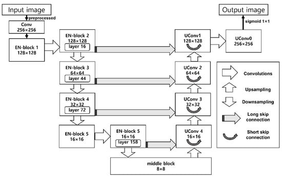 The detailed pixel information of an image in the model can disappear [14] during the sampling process, such as downsampling and upsampling. This is a big problem in segmentation. Spatial information can be recovered [24] using a skip connection from the encoder to the decoder. Skip connections were first introduced in FCN for semantic segmentation [14]. With skip connection, better prediction is possible by reflecting precise pixel information [14]. The skip connection is useful in deep neural network architectures such as residual networks (ResNet) [6] and dense networks [25,26]. It is also beneficial to enhance gradient flow and improve the performance of overall classification networks [6].