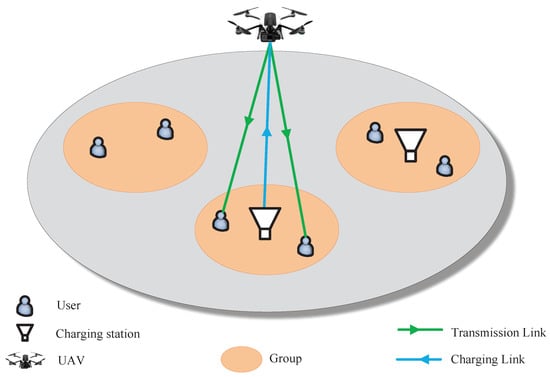 The size of data requested by user i located at is , . After flying to the center of group j, whose coordinate is , , the UAV can first charge its battery if group j owns a CS. Then, the UAV BS provides service to all users in group j simultaneously.