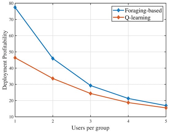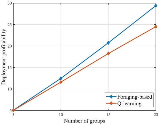 Figure 2 shows that the deployment profitability changes as the number of groups changes. From Figure 2, we can see that, for both considered algorithms, the deployment profitability increases with the number of groups increasing. This is due to the fact that as the number of user groups increases, the user groups that can be served by the UAV and the energy that is harvested by the UAV increase. In Figure 2, when the number of groups , the foraging-based algorithm achieves a deployment profitability of , while the Q-learning algorithm achieves a deployment profitability of . The proposed foraging-based algorithm yields up to 20.0% gain in terms of deployment profitability compared to the Q-learning algorithm. This gain stems from the fact that the proposed algorithm can find the optimal potential served groups which maximizes the deployment profitability, while the Q-learning algorithm may find a sub-optimal group selection which leads to a worse value.