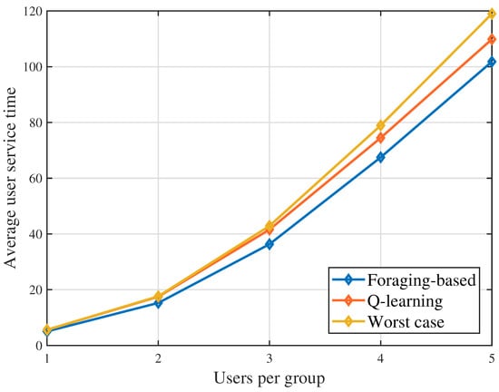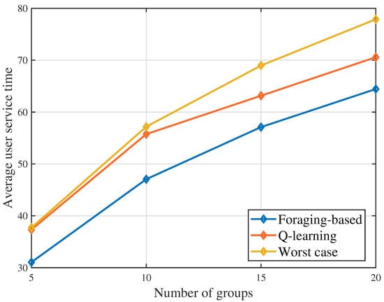 Figure 4 shows that the average user service time changes as the number of groups varies. With the increasing of groups, the average user service time also increases. This is due to the face that the increasing of groups gives the UAV more options of selecting potential served groups so as to increase the deployment profitability. Serving more groups makes the users in the later served groups have to wait for a longer time before the UAV comes and provides service. From this figure, we can also see that the proposed foraging-based algorithm achieves lower results than Q-learning algorithm. This is because the proposed algorithm designs the UAV trajectory based on a greedy policy, which solves the queuing problem of minimizing the queuing time. However, the optimization process of the Q-learning algorithm may stuck in a sub-optimal trajectory. In Figure 4, when the number of groups , in terms of the average user service time, the foraging-based algorithm achieves up to and reduction compared to the worst case baseline and the Q-learning algorithm, respectively.