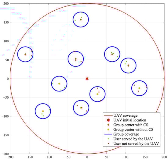Figure 6 shows the users served by the UAV of an arbitrary case after the UAV follows the optimal trajectory designed by the foraging-based algorithm. In this case, groups are distributed in the wireless network and the UAV selects the potential served users with the maximal deployment profitability. From Figure 6, we can see that the UAV does not only serve the groups with CSs and the groups near to the initial position, but also serves the groups without CSs and the groups far from the initial position. This is due to the fact that the UAV jointly considers the distance and the existence of CSs, which decides the consumed energy and the harvested energy, and further affects the profitability of serving a group.