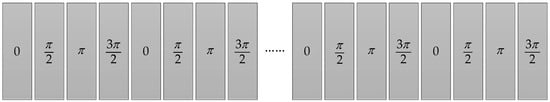 After modifying the arrangement of the index grating’s incremental windows according to Figure 4, ideally, the phases of the Moiré fringe signals received by the photoelectric device are 0, , , and , respectively. This arrangement is shown in Figure 5.