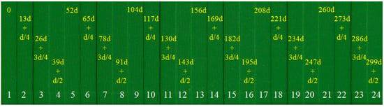 The single-field scanning absolute linear encoder that we studied adopted the shutter-shaped Moiré fringe. The influence of linear errors on the quality of Moiré fringe signals is reduced by modifying the arrangement of the incremental windows of the index grating. Figure 4 shows the arrangement of the index grating’s incremental windows. The 24 grating patterns correspond to the 24 pixels of the single-filed scanning photoelectric device. The number of each grating pattern is shown in white at the bottom of Figure 4, and the size of each grating pattern is 0.26 mm (width) × 1.6875 mm (height). The grating period of is 20 μm. The yellow numbers in each grating pattern indicate the starting position, and the first, second, third, and fourth grating patterns begin with 0, , , and , respectively, and so forth. The four grating patterns form a group. The distance between the starting positions of two adjacent groups is . The four grating patterns in other groups are arranged in a similar way.