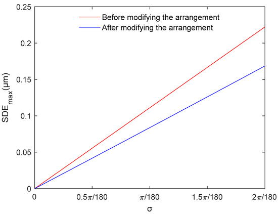 The maximum SDE caused by linear errors under the two arrangements is compared in Figure 6. After modifying the arrangement of the index grating’s incremental windows, the maximum SDE considerably decreased. When , the maximum SDE decreases from 0.111 μm to 0.084 μm, which is a 24.32% reduction. When , the maximum SDE decreases from 0.222 μm to 0.169 μm, which is a 23.87% reduction. Because can be easily controlled within , the maximum SDE caused by linear errors considerably decreases after modifying the arrangement of the index grating’s incremental windows.