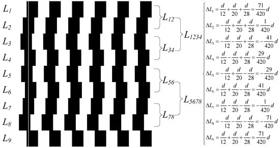 In accordance with the above theory, the index grating’s phase-shift pattern is designed and illustrated in Figure 7. The black zones represent the chrome-plated area of the index grating, which is opaque, and the rest of the area is transparent. The white line in the first black column is the centerline before phase shift. In Figure 7, the grid lines are divided into nine rows: L1, L2…L9. The right-moving distances of the rows are ΔL1, ΔL2…ΔL9, and the height of each row is H/8, where H is the height of the incremental track detector. Row L1 can be regarded as moving to the right by , and row L2 can be regarded as moving to the left by . Therefore, the third-order harmonic can be suppressed with the superposition of signals generated by L1 and L2. Similarly, with L3 and L4, L5 and L6, and L7 and L8, the third-order harmonic can be suppressed. After the third-order harmonic is suppressed, the combination of L1 and L2, namely L12, can be regarded as moving to the right by , and the combination of L3 and L4, namely L34, can be regarded as moving to the left by . Therefore, the fifth-order harmonic can be suppressed with the superposition of signals generated by L12 and L34. Analogically, with L56 and L78, the fifth-order harmonic can also be suppressed. After the third- and fifth-order harmonics are suppressed, the combination of L1, L2, L3, and L4, namely L1234, can be regarded as moving to the right by , and the combination of L5678, can be regarded as moving to the left by . Therefore, the seventh-order harmonic can be suppressed with the superposition of signals generated by L1234 and L5678. Using this design, the third-, fifth-, and seventh-order harmonics are suppressed.