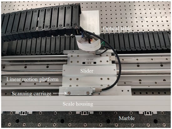 The position error over the linear encoder’s entire measuring range can be determined by laser interferometer [17,18]. The SDE of the linear encoder can be measured by the constant-speed approach [31], which we adopted in our experiments. The experimental setup, shown in Figure 10, was placed in a temperature- and humidity-controlled room. The scale housing of the tested absolute linear encoder was fixed on the marble, and the scanning carriage was fixed on the slider of the linear motion platform (SLP25-1000-S-M3-A3, NPM, Tokyo, Japan). The linear motion platform and the marble were fixed on the optical table.