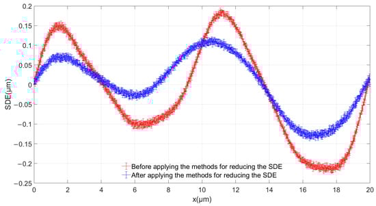 We set the speed of the linear motion platform to 100 mm/s, while the grating period of the absolute linear encoder’s incremental track was 20 μm, and the sampling frequency was 5 MHz, so there were 1000 sampling points in each period. The initial position corresponded to 0 μm, the last sampling point corresponded to 20 μm, and the distance between adjacent sampling points was 0.02 μm. The position of each sampling point can be regarded as the theoretical position of , and can be obtained through Equation (4). Finally, the SDE can be obtained through Equation (5). In order to verify the reliability of the results, we obtained five periods before and after applying the methods for reducing the SDE. The five periods were different grating periods selected in a measurement range. Figure 11 shows the average results of the SDE curves, with the error bar representing the standard deviation. Before applying the methods for reducing the SDE, the SDE is within ±0.218 μm. After applying the methods for reducing the SDE, the SDE is within ±0.135 μm. The SDE has been decreased by 38.07%. We concluded that our proposed methods for reducing the absolute linear encoder’s SDE are effective.