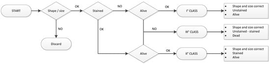 The second operating mode was the selection of the cocoons, with the use of the models described in points 2.2, 2.3 and 2.4, which were integrated into the software, exporting a library, one for each model, using the Matlab compiler. The image from the camera applied the relative algorithm of the model, returning if the cocoon was fit or not, for its related class. This procedure was applied for all the three cameras, except for the photodiode sensor, whose model was applied internally to the software without the use of external libraries, implementing a method that calculates the formula with the relative weights generated by the model.
