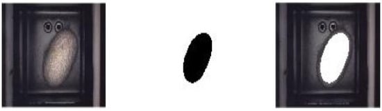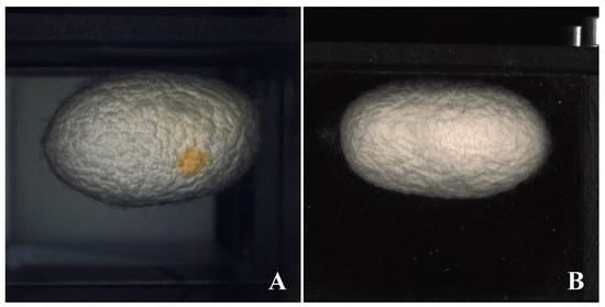 This step consisted of a station where cocoons were selected according to their shape. A digital camera was placed about twenty centimeters above the cocoon resting space, and in between, there was a light-emitting diode (LED) light made by Banner, model LEDWO50M, which could project white light on-axis with the camera lens to produce even lighting on the surface of the object. Images were acquired by an optoelectronic system based on a GigE Vision Camera Manta G-504B/C with a 5 megapixel (MP) Sony ICX655 RGB sensor operating at a resolution of 1292 × 964 pixels. Cocoon shape and size were extracted through an image analysis protocol (Figure 3).