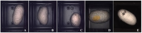 (A) Regular cocoon, (B) defective shape, (C) incorrect size due to positioning, (D) stained at the top (large orange spot), (E) stained at the bottom (black spot).