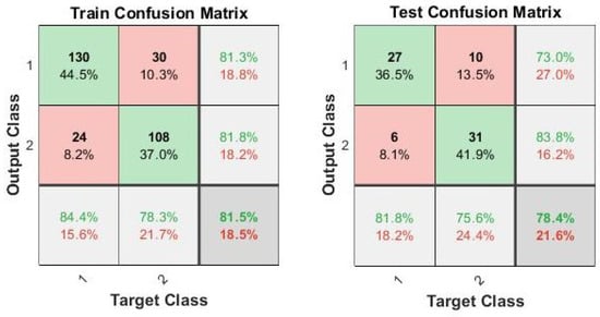 The performances of the prototype in dead-cocoon selection based on the logistic regression model from the photodiode matrix are summarized in Figure 8. The correct classification ratio obtained for dead-cocoon selection is 81.5% on the training set and 78.4% on the test set. Cross validation with 100 steps was also performed with an average accuracy of 80.7% and 81.6% in training and testing, respectively.