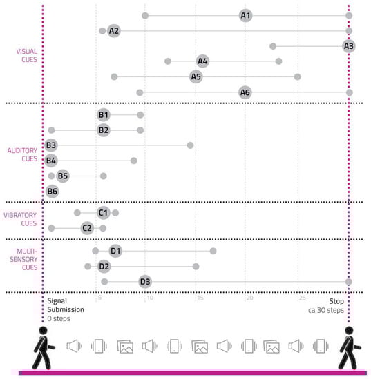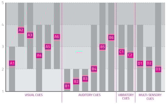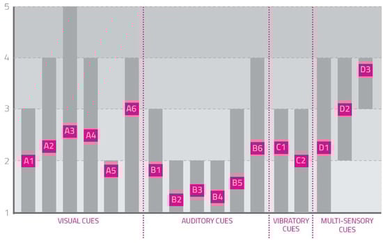 Even the users’ answer variance was analyzed to understand if they all perceived cues as invasive and annoying in the same way. From the scheme it is possible to note that some cues, especially auditory ones, were similarly perceived in all tests (A1, A5, B1, B2, B3, B4, B5, C1, C2, D2, D3); for some others, particularly for visual cues, the users’ scores were both low and high (A2, A3, A4, A6, B6, D1), highlighting the influence of personal preferences and attitudes in the perception of invasiveness.