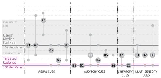 From this visualization, it was possible to deduce that visual cues and some of the auditory ones were the most difficult to follow for the users; the remaining visual cues and the vibratory and multisensory ones were all perceived as moderately complex. The metronome auditory cue was the only one considered moderately challenging to follow by the users.