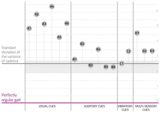 The scheme also analyzed the variance of answers given by users to understand if they all perceived cues as difficult to follow in the same way. It was then possible to note that only some visual and auditory cues were similarly perceived in all tests (A1, A2, A5, B1, B2, B3, D2); the other cues elicited a broad difference of given marks (A3, A4, A6, B4, B5, B6, C1, C2, D1, D3), highlighting the influence of personal attitudes in the perception of the difficulty of following the suggested rhythm.