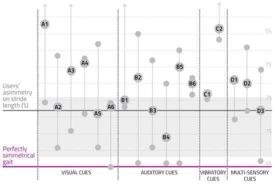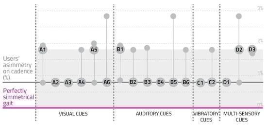 Qualitative parameters collected and analyzed were levels of perceived invasiveness and annoyance, and perceived difficulty in following the signal. The quantitative ones were the difference between users’ cadence and the target one, the number of steps to reach the cadence of 100 steps/min, the users’ cadence variability, the rhythmic asymmetry (users’ asymmetry index on cadence, and rhythmic asymmetry), and users’ asymmetry index on cadence.