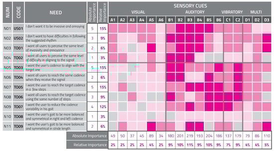 At this point of the design process, the authors’ aim was to experiment with a strategy to combine obtained results to hierarchize the cues’ effectiveness, considering all detected parameters and users’ points of view, comparing them, and weighing their relative and absolute importance. This hierarchy was supposed to allow the selection of a small number of sensory cues to be submitted to people with PD in the following steps of the research project, avoiding wasting time in testing ineffective solutions. The second aim of this initial project phase, slowed down by pandemic restrictions, was to test an innovative methodology able to match qualitative and quantitative aspects for exhaustive evaluation of the developed solutions.