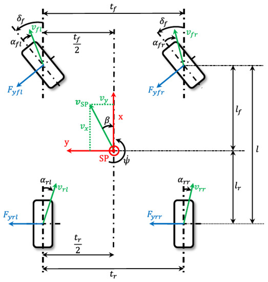 The single-track model (or bicycle model) has a good performance estimate of side-slip angle and yaw rate at low lateral acceleration. The state model can be defined as follows: