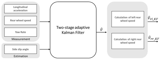 The estimation of the left and right rear wheel speeds will be carried out in two steps. First, a two-stage adaptive Kalman filter, which was designed first in [21], is used to estimate the longitudinal speed of the vehicle, and then this speed is employed to calculate the left and right rear wheel speeds. The structure of the process is shown in Figure 4.