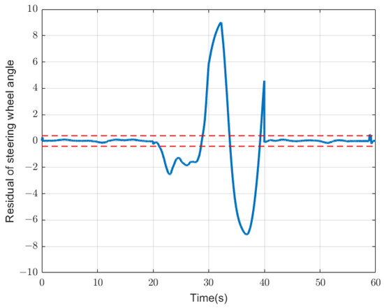 However, there are also problems in the fault diagnosis of the actuator. For example, in Figure 26, the diagnosis result shows the fault 1.8 s slower than the actual fault occurs. We can also see in Figure 27 the residual that was used for diagnosis: the position where the alarm occurs is consistent with the position where the diagnosis result shows the fault, i.e., it is later than the actual situation. To find the reason, we need to pay attention to the actual torque. As can be seen from Figure 28, the actual torque of the motor is already very small in the three seconds before the fault, which leads to the actual state of the car and the ideal state status being not much different, and leads to subsequent misdiagnosis.