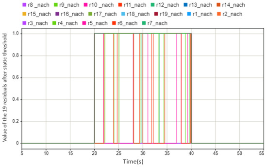 The values of the four residuals after threshold, this case is that when IMU sensor fails between 20 s and 40 s (0 means there is no abnormal situation, 1 means there is an abnormal situation).