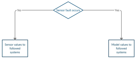 Because this article is based on the demonstrator vehicle in the “SmartLoad” [12] project, we first briefly introduce the sensors contained in the demonstrator vehicle. The demonstrator vehicle has a steering-wheel angle sensor, a steering-wheel torque sensor, a force sensor for measuring the force on the tie rod, two wheel-speed sensors on the rear wheels and an IMU (Inertial Measurement Unit). Therefore, the following research will mainly focus on the condition monitoring of these six sensors. The main steps in the state detection of the sensors are designed to obtain the predicted values of the six sensors through different mathematical models, which were described in Section 3.1, Section 3.2, Section 3.3, Section 3.4, Section 3.5 and Section 3.6. To ensure the accuracy of the predicted model, the models were then verified in Section 3.7. After ensuring the accuracy of the models, the predicted values were compared with the measured values of the sensors to obtain the residuals, which was introduced in Section 3.8, and the residuals were further analyzed to obtain the state information of the sensors, which were described in Section 3.9.