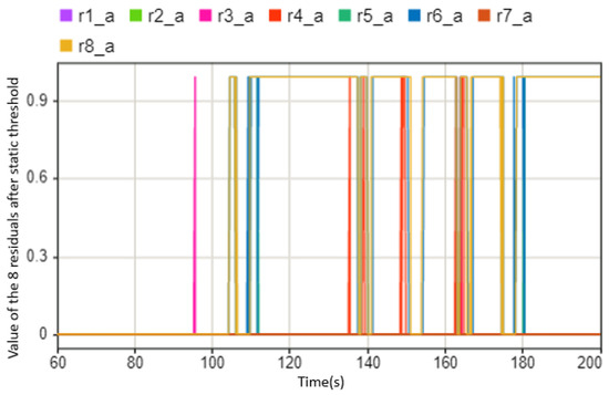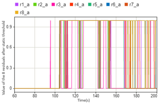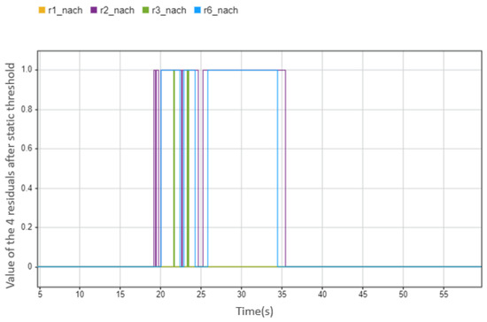 The values of the four residuals after threshold. This case shows when the steering motor 1 fails at 123.5 s (0 means there is no abnormal situation, 1 means there is an abnormal situation).