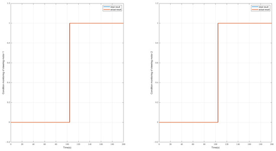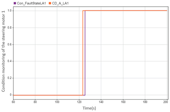 Result of condition monitoring of steering motor 1. Diagnostic result of condition monitoring of the steering motor 1: the case is that the steering motor 1 fails at 123.5 s, but the diagnostic result shows the failure is at 125.3 s (“CD” is an abbreviation for “condition”; “0” refers the normal state; “1” refers the faulty state; the orange line refers to the real state of the steering motor 1; the purple line refers to the diagnostic state of the steering motor 1).