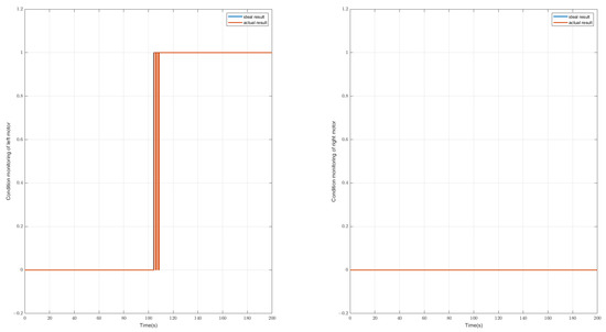 The diagnostic result of condition monitoring of the driving motors. This case shows that the left driving motor fails at 104 s. (left: results for left motor, right: result for right motor, blue line: real state of the driving motor, red line: diagnostic state of the driving motor).