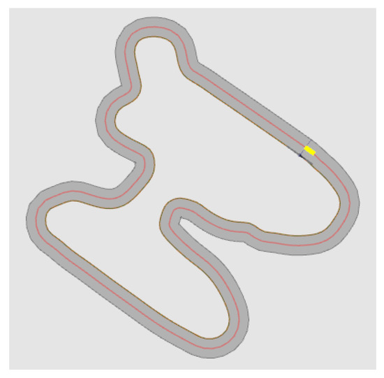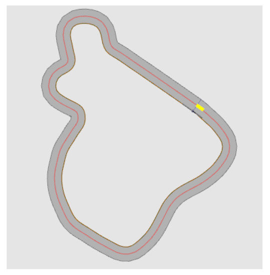 Long round driving test circuit, the red line represents the route, and the yellow square represents where the car starts driving.