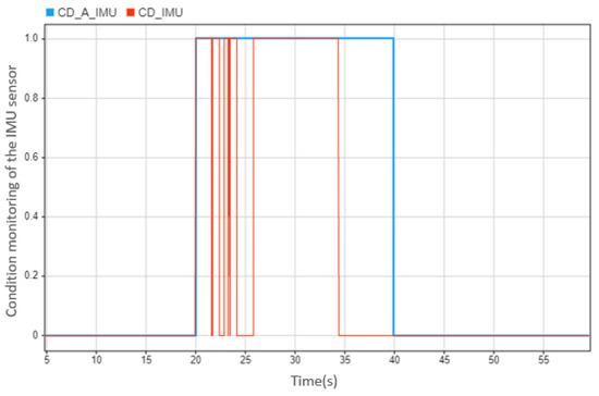 The diagnostic result of condition monitoring of IMU sensor: the case is that the IMU sensor fails between 20 s and 40 s, but the diagnostic result shows the failure is only between 20 s and 34.4 s (“CD” is an abbreviation for “condition”, “0” refers the normal state, “1” refers the faulty state, the blue line refers to the real state of the IMU sensor, the red line refers to the diagnostic state of the IMU sensor).