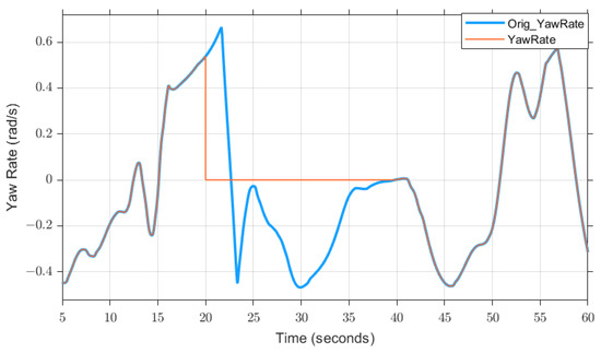 Although the overall accuracy rate of the tests is already very high, if it is aimed at a single test, there are still problems. For example, in the case of a total-loss fault of the IMU sensor, the accuracy rate is only 0.86. Figure 21 shows the diagnostic results (blue line) and the actual state of the fault (red line). It can be seen from the figure that no fault is detected between 35 and 40 s, and the same problem still exists between 24.5 and 25.5 s. To find the reason for this, we can look at the original sensor data. As shown in Figure 22, the blue line refers to IMU sensor data with no fault, and the red line refers to IMU sensor data with total-loss fault between 20 and 40 s. From Figure 22, we can easily see that the time range where the fault detection fails to refer to the time range where the deviation between the normal data (blue line) and the faulty data (red line) is very small. For example, at about 25 and 35 s, the actual yaw rate is already around 0, and the sensor reading of the total-loss fault is 0, so it is difficult to diagnose the fault in this state. Moreover, since the static threshold is used in this paper, it cannot change with different driving conditions, which provides an obstacle to the detection. It can be seen from Figure 23 that the residual values used to judge the IMU fault at 25 s and at 35 s had no warnings appear.