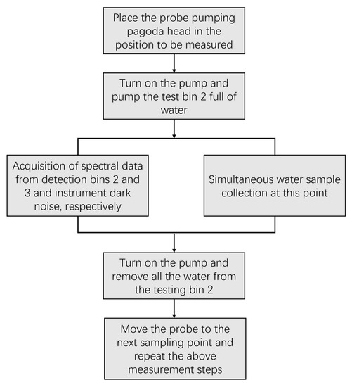 Field survey measurements were conducted in Chaohu Lake (19 September to 21 September) and Taihu Lake (23 September to 25 September) in 2022, with 20 and 30 monitoring points, respectively. In Figure 3a,b, the geographic coordinates of the sampling sites in Chaohu and Taihu Lake are shown. In the range of 0–2 m underwater, the sample data of one–three depths were taken for each sampling point. The self-developed lake cyanobacterial biomass spectral-detection system was used to measure the spectral data of water bodies. The main principle of this equipment is to collect the absorption spectrum of substances in the water body through the alignment layout of the light source and the spectrometer, designed with a separate structure above and below the water to meet the needs of underwater operations from 0 to 2 m. The lake cyanobacterial biomass spectral detection system is shown in Figure 4. The underwater probe section sets up three test bins. The No. 1 test bin is empty, the No. 2 test bin load has lake water, and the No. 3 test bin load has distilled water prepared by the laboratory. The signal-to-noise ratio is greater than 2000:1. The spectral range of the equipment covers 200–1000 nm; the spectral resolution is better than 1 nm. When collecting spectral data, we place the probe pumping pagoda head in the position to be measured. After detection bin 2 has been pumped full of water, the spectral data of detection bins 2 and 3 and the spectrometer dark noise data are collected, respectively. After the collection has completed, detection bin 2 is controlled for drainage. When the detection bin 1 and 2 spectral curves consistently prove that all the water has been drained, the probe position is moved for the subsequent sampling-point measurement. The data collection flow is shown in Figure 5. The water samples were collected simultaneously using a water collector, stored at a low temperature (4 °C) under light-proof conditions, and then filtered within 6 h after the collection had been completed. Chla concentrations of water samples were measured in the laboratory at the end of the collection survey (no more than 5 days).