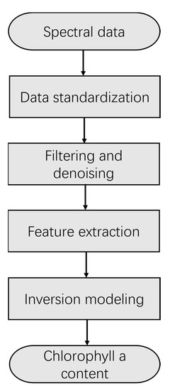 In this paper, the spectral data collected from field experiments in Chaohu Lake and Taihu Lake were analyzed together with the results of water sample assays to construct an algorithmic model for the inversion of cyanobacterial Chla in the water column of eutrophic shallow lakes. The data processing mainly included four steps: data normalization, filtering and denoising, feature extraction, and inversion modeling. The data processing flow is shown in Figure 6.