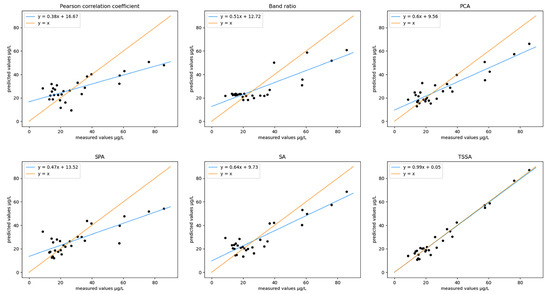 Compared with the other five feature extraction methods, the TSSA algorithm has obvious superiority in spectral feature extraction. First, in principle, the “correlation coefficient method” and the “band ratio method” only rely on a small amount of band information to establish a linear fit to the calibration data. The models are easily overfitted in the training set and poorly predicted in the validation set [23,24]. “Principal component analysis” (PCA) is suitable for data with a strong correlation between variables, but if the correlation of the original data is weak, it will not play a good role in dimensionality reduction, and the meaning of principal components will be more ambiguous than that of the original data [25,26]. The “Successive projections algorithm” (SPA) does not consider the maximization of irrelevance globally, only locally [27,28]. The SA algorithm has only a global optimization process and jumps out of important bands too quickly when updating combinations, leading to poor modeling results. Moreover, the algorithm cannot determine feature relevance [2,3,4]. The TSSA algorithm has both global and local optimization, which can ensure the efficient operation of the algorithm and does not transform the original data. It has a clear interpretation of the meaning of the feature extraction results. The combined optimized feature extraction avoids the overfitting caused by fewer features. The addition of the Boruta algorithm enables it to accurately determine the correlation between spectral features and dependent variables. It can eliminate irrelevant variable interference and reduce data redundancy. Second, in terms of modeling accuracy comparison results, as shown in Table 2, compared with the other five feature extraction methods, using the TSSA algorithm for feature extraction, the modeling accuracy indexes are significantly improved, with the determination coefficient R2 increased by 0.1908–0.4623, RMSE decreased by 5.7039–10.249 μg/L, and MAE decreased by 4.1575–7.6202 μg/L. As the comparison in Figure 8 shows, the fitted straight line between the predicted and measured values of the validation dataset using the TSSA algorithm is y = 0.99x + 0.05, which has the highest overlap with y = x, indicating the best modeling effect.